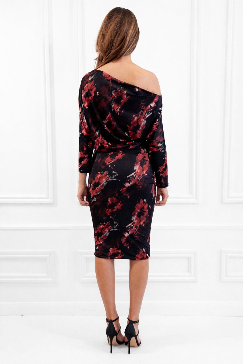 AUBREY BLACK RED BARDOT BATWING FLORAL MIDI WEDDING GUEST MIDI DRESS