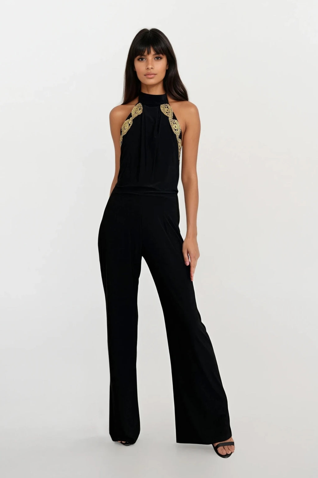 SASHA BLACK BACKLESS JUMPSUIT WITH WIDE LEGS AND GOLD LEAF TRIM