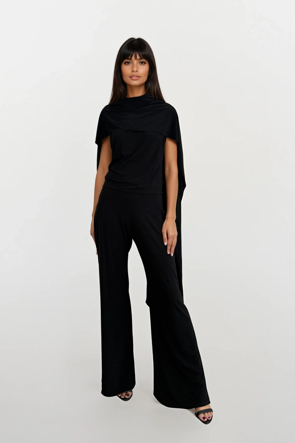 CALLIE BLACK ONE SHOULDERED JUMPSUIT WITH TIE SCARF WITH GOLD BUCKLE